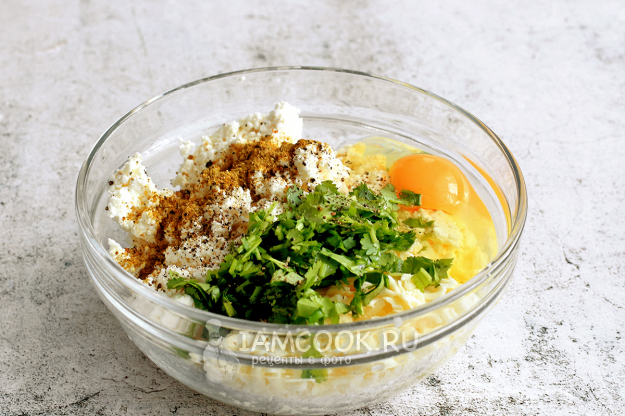 В емкость натрите сыр, добавьте творог, яйцо и перемешайте вилкой до объединения. Добавьте соль по вкусу, специи и зелень.