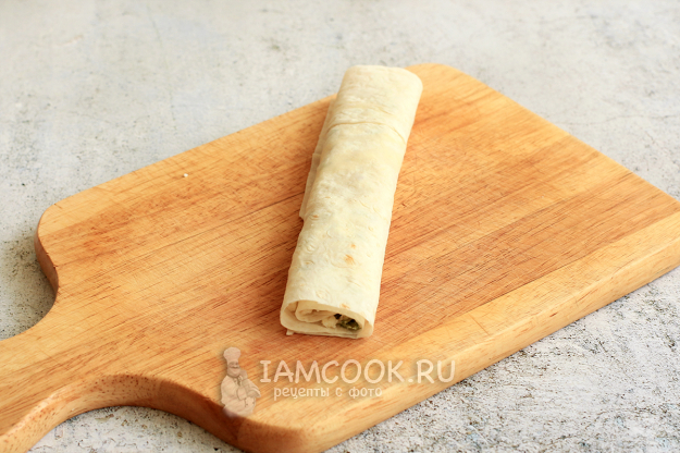 Сверните лаваш трубочкой и разрежьте пополам.