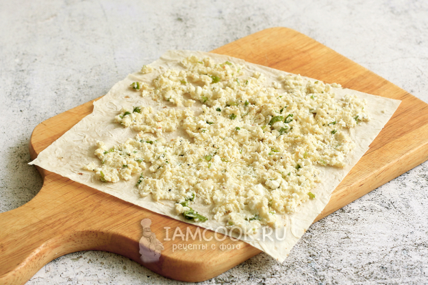 Распределите начинку по лавашу так, чтобы у краев оставалось свободное место.