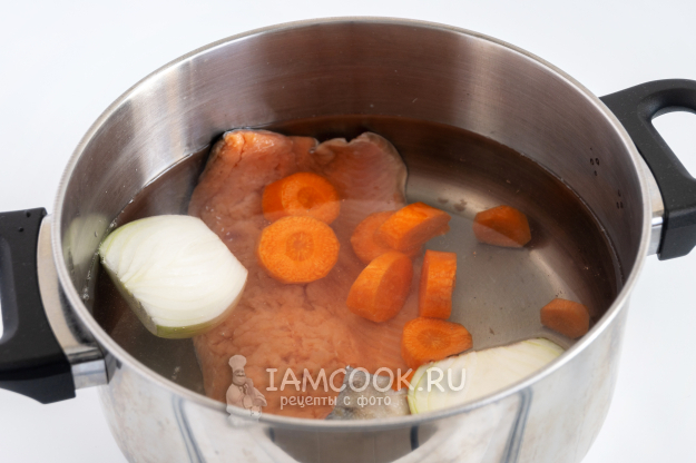 А также нужно отварить горбушу. Для этого положите в кастрюлю рыбу, крупно нарезанную морковь и лук. Влейте воду, так, чтобы она покрывала рыбу, и поставьте на огонь.