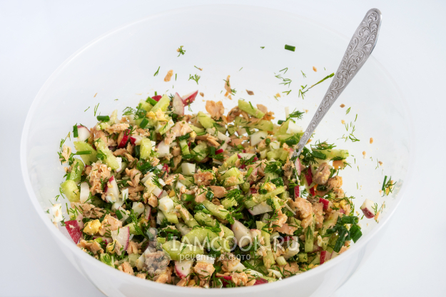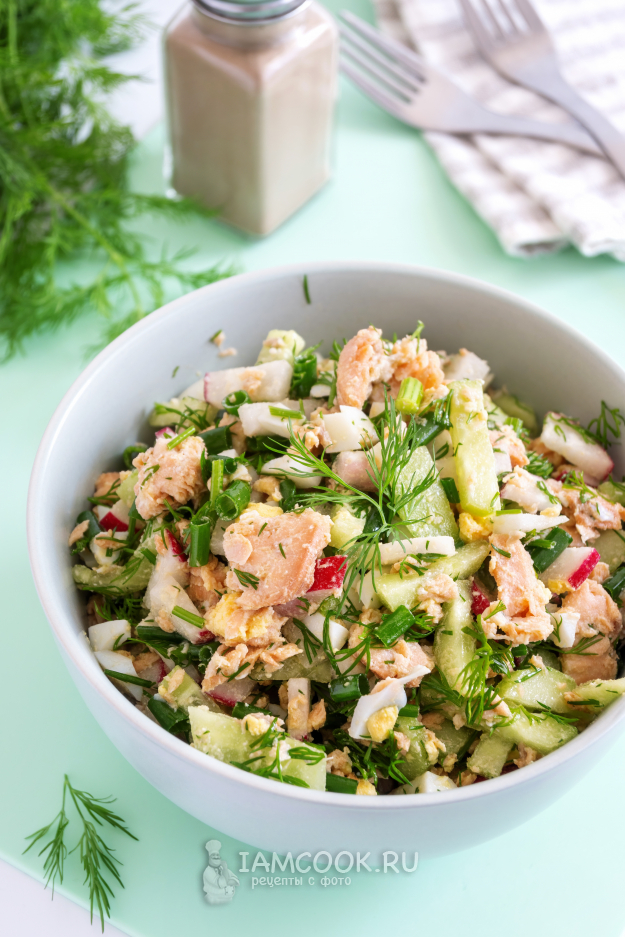Салат из вареной горбуши с вареными яйцами и зеленью готов! Можно сразу подавать на стол.