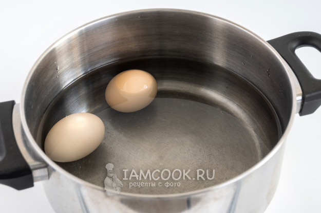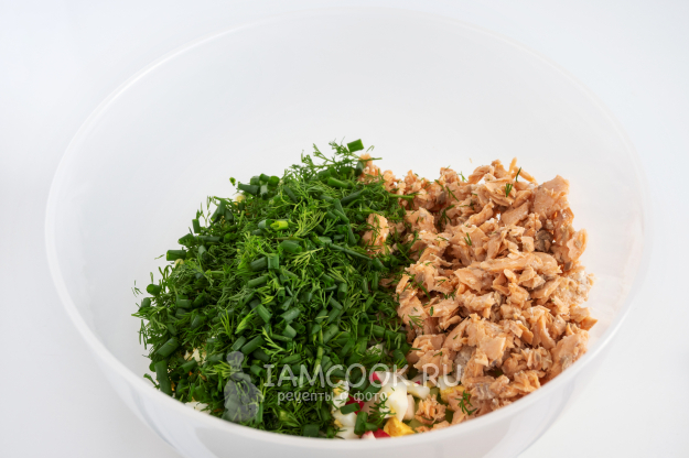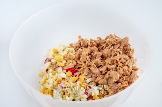 Положите в салатник нарезанные яйца и остывшее мясо горбуши.