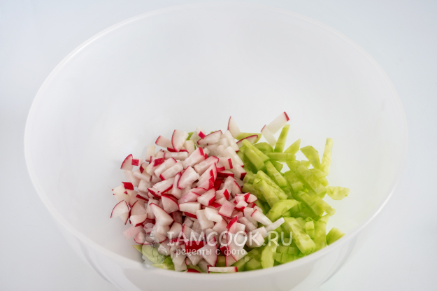 Нарежьте огурцы и редиску. Огурцы я предварительно ещё очистила от кожуры, но это не обязательно.