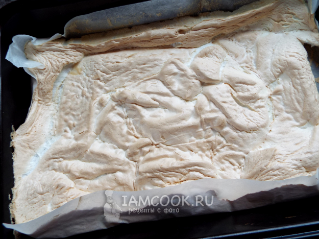 Выложить массу на пергамент и разровнять. Мой противень - размером 20x30 см.