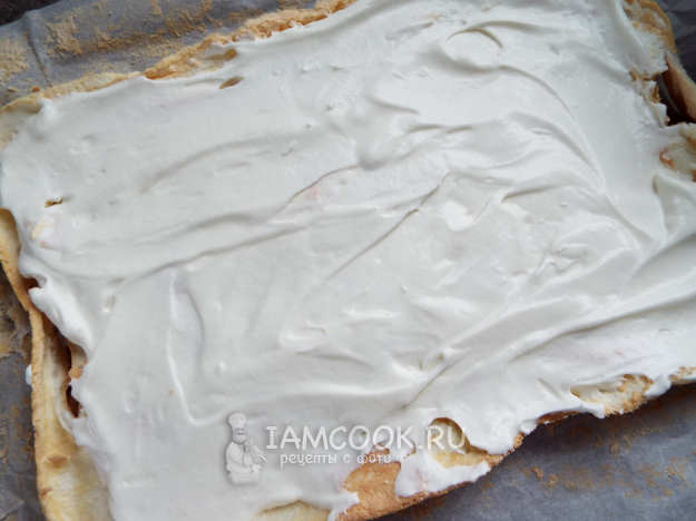 Меренгу перевернуть, снять бумагу. Нанести крем.