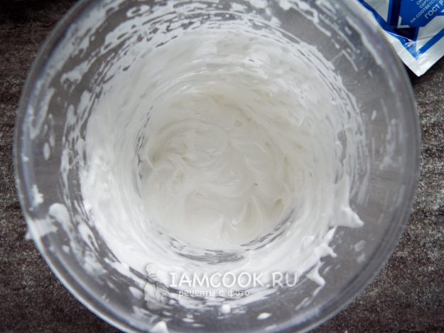 Белки и сахарную пудру взбить в крепкую белую пену, в конце добавить крахмал.