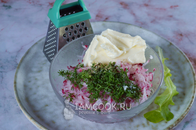 Редис натереть на терке, выложить на бумажное полотенце, чтобы впиталась лишняя жидкость.