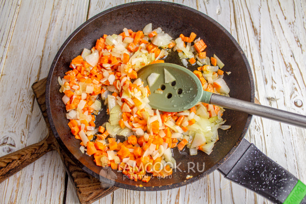 Лук и морковь нарежьте мелким кубиком, обжарьте до мягкости.