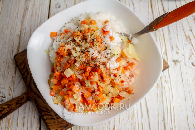Соедините для начинки фарш, полуготовый рис, обжаренные овощи. Посолите и поперчите по вкусу и хорошо перемешайте.