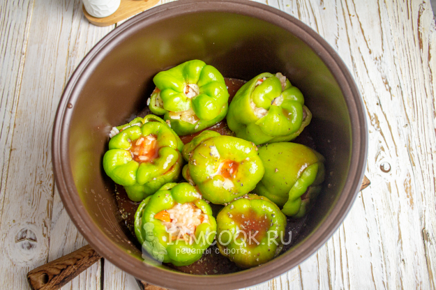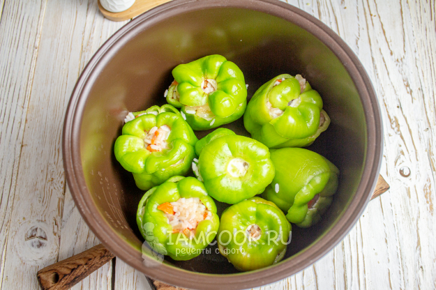 Полученной начинкой нафаршируйте подготовленные перцы, выложите в чашу мультиварки.