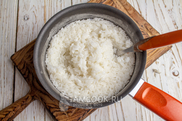 Рис промойте тщательно, залейте водой и варите с момента закипания около 5-7 минут, лишнюю воду (если осталась) слейте.