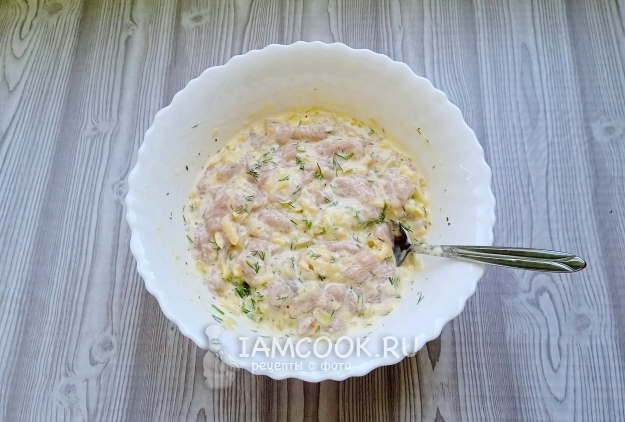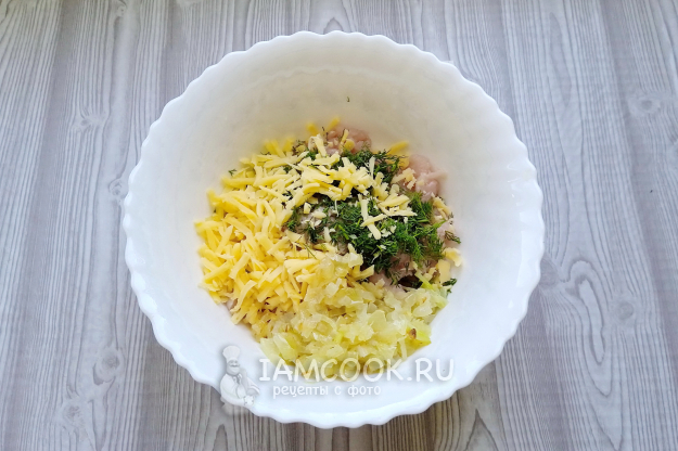 Любой твердый сыр по вкусу натрите на терке и добавьте к рубленой индейке. Выложите жареный лук, измельченный чеснок и мелко нарезанный укроп.