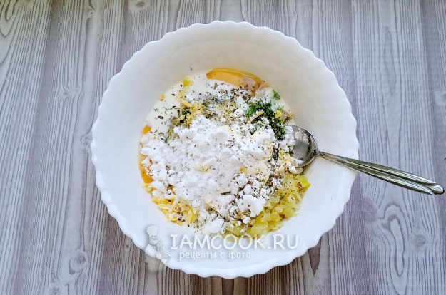 Добавьте яйца, кефир, майонез, крахмал, соль и перец.