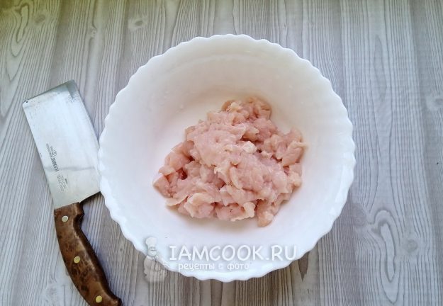 Филе индейки помойте и мелко порубите ножом. Удобно это сделать ножом с широким лезвием.