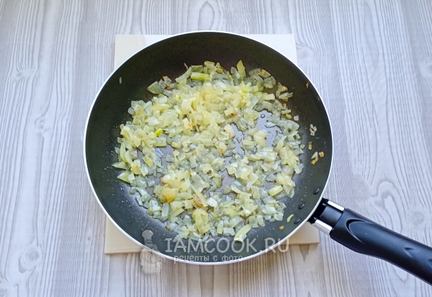 Репчатый лук очистите, помойте и мелко нарежьте. Выложите в сковороду и обжарьте на растительном масле.