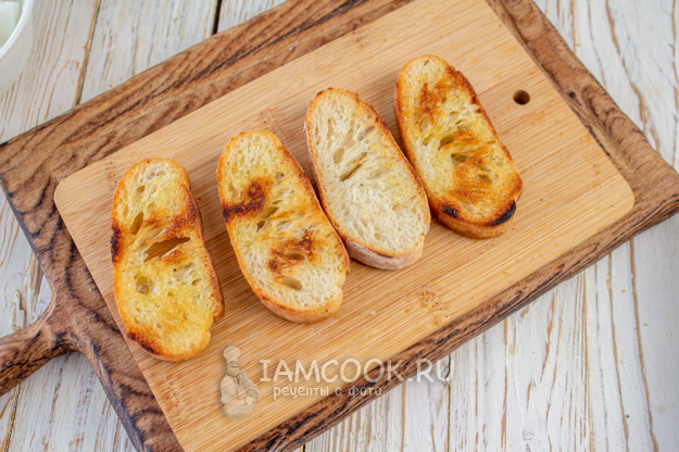 Багет нарежьте на тонкие ломтики и подсушите на сухой сковороде с двух сторон.