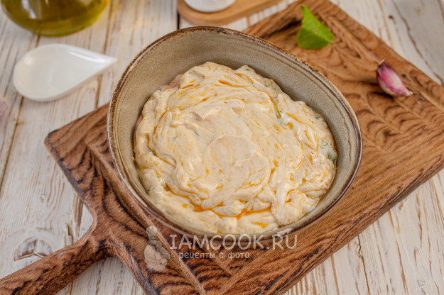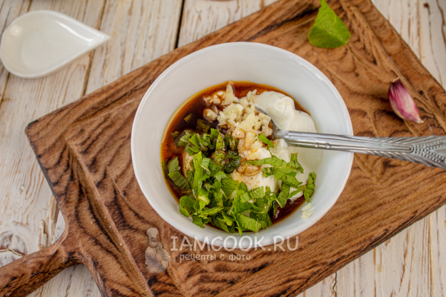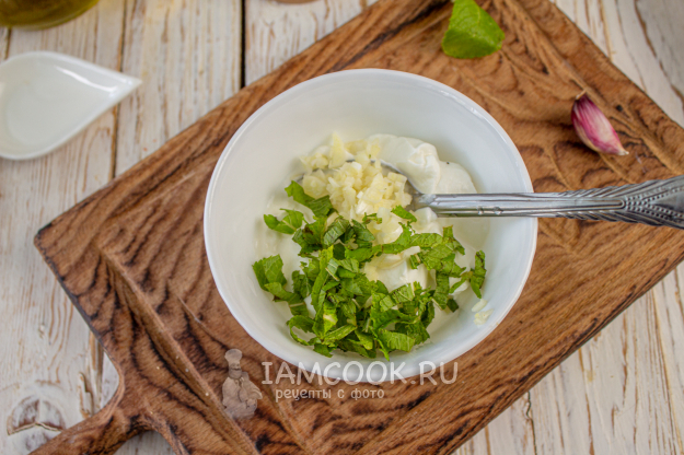 В подходящую посуду выложите греческий йогурт, добавьте измельченный чеснок и нарезанную мяту.