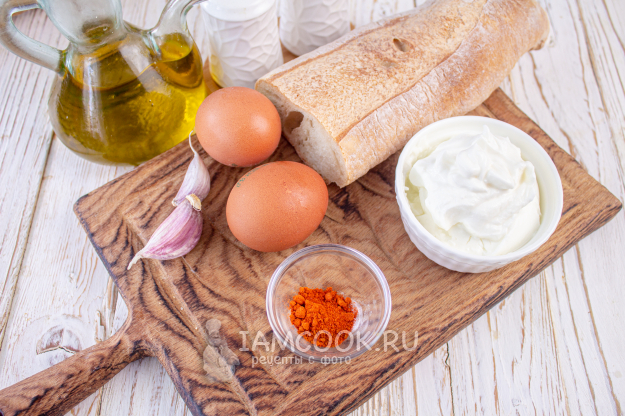 Возьмите все необходимые продукты для приготовления яиц по-турецки с йогуртом (Cilbir, Чилбир). Греческий йогурт возьмите качественный, с высоким % жирности, используйте багет или чиабатту и обязательно качественное нерафинированное оливковое масло Extra virgin.