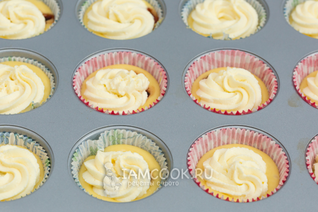 Тесто выложите в формочки для маффинов. Желательно использовать вкладыши. Если нет таких - смажьте форму маслом, но если форма имеет хорошее покрытие, то и смазывать не придется.