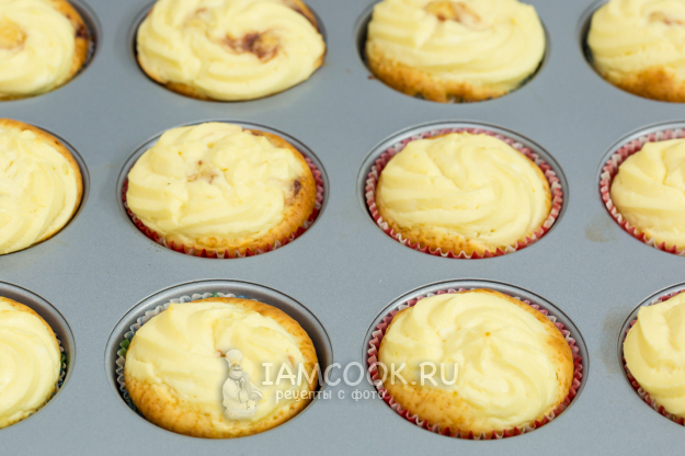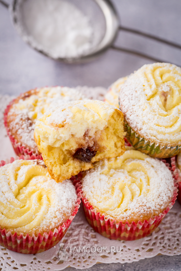 Маффины с начинкой и воздушной творожной шапочкой готовы.