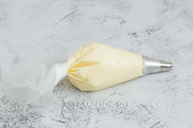 Выложите его в корнетик с насадкой. Это делается для того, чтобы творожная шапочка была рельефной, красивой. Если нет насадки и корнетика, можно выложить творожный крем в пакет либо аккуратно выкладывать его потом чайной ложкой.