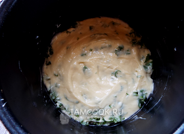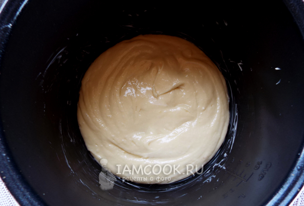 Чашу мультиварки смазать сливочным маслом, выложить половину теста.
