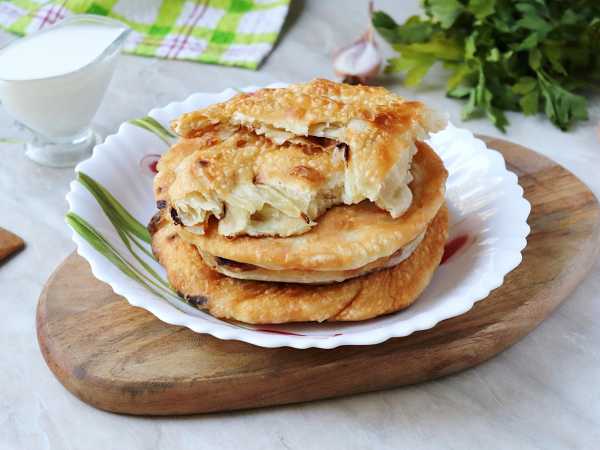 Жарить тонкий зеленый лаваш с обеих сторон по минуте-две, до лёгкого подрумянивания.
