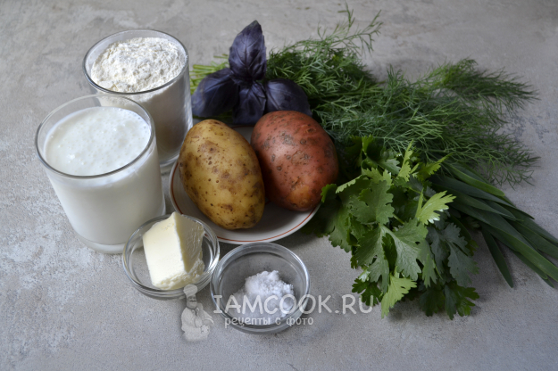 Возьмите продукты для приготовления чуду по-дагестански с картошкой и зеленью на сковороде. Тесто для чуду можно замесить на воде или кисломолочном продукте. Я делаю тесто на кефире.