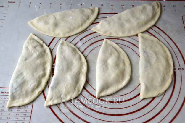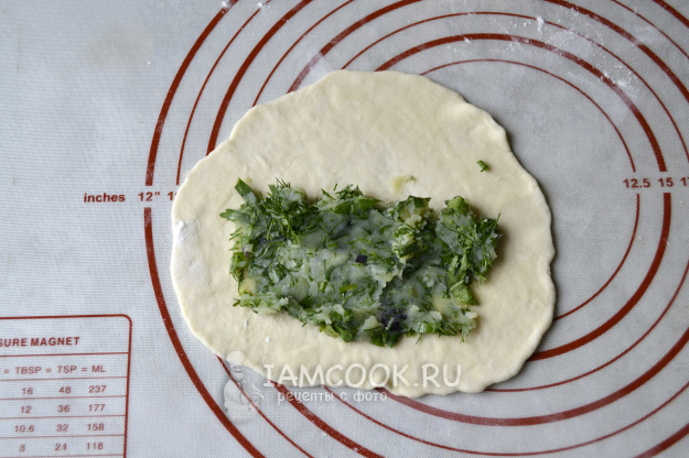 Отдохнувшее тесто разделите на равные небольшие кусочки. Раскатайте первый кусочек в тонкую лепешку. На половину лепешки положите начинку.