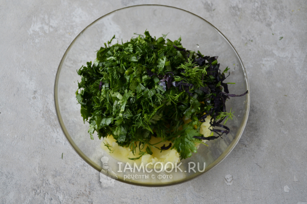 Добавьте нарезанную зелень в миску к пюре. Немного посолите и посыпьте черным молотым перцем.