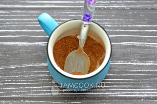 В кружке смешайте какао-порошок, сахар и ванилин.