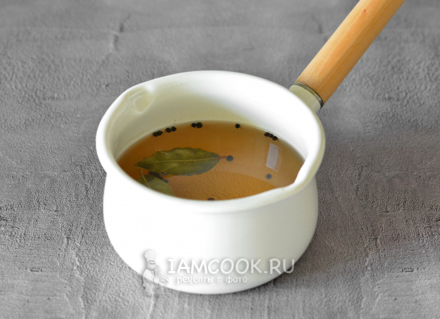 Приготовьте рассол. Для этого вскипятите воду с солью, сахаром, лавровым листом и горошинами перца. Остудите до комнатной температуры.