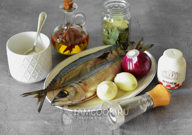 Подготовьте все необходимые ингредиенты для засолки скумбрии в рассоле кусочками (с луком и маслом). Рыбу разморозьте, выпотрошите, удалите все плавники и чёрную плёнку внутри. Промокните салфеткой.