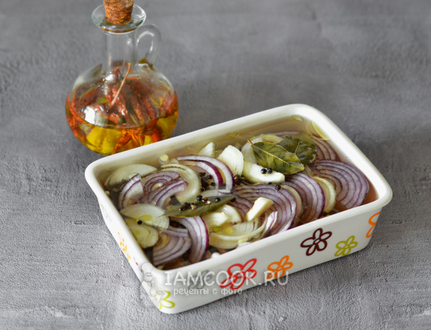 Подберите контейнер, чтобы кусочки рыбы вошли в него по высоте. Сложите в один ряд кусочки рыбы, сверху выложите нарезанный лук. Залейте рыбу с луком рассолом, чтобы он покрыл их, добавьте масло.