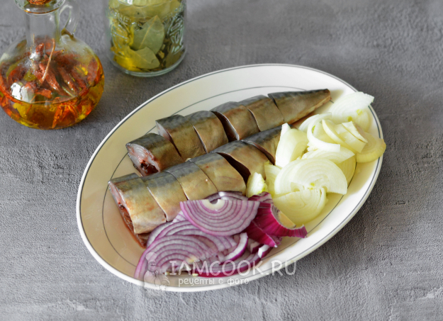 Скумбрию нарежьте на кусочки, удалив голову и хвост. Лук нарежьте полукольцами.