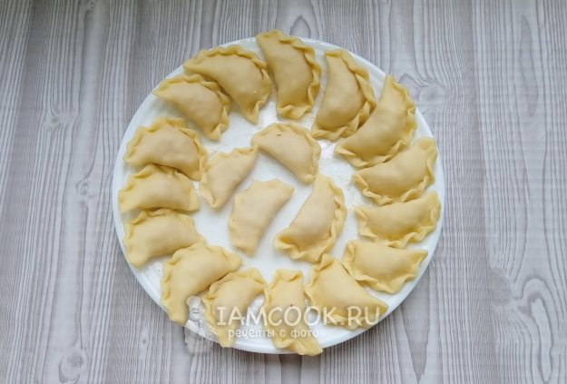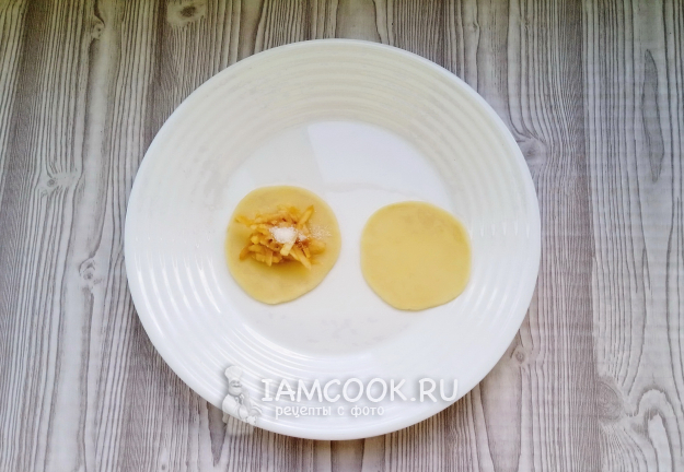 Сформируйте вареники с яблочной начинкой, соединяя края теста. Выложите их на тарелку или разделочную доску, присыпанную мукой.