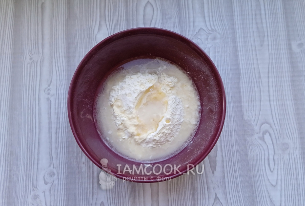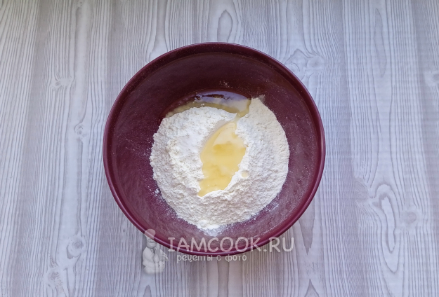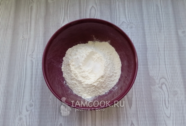 Замесите тесто для вареников. В миску насыпьте муку и соль.