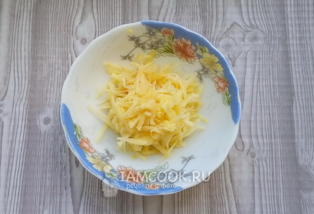Приготовьте начинку. Яблоки помойте, очистите и натрите на терке. Очень сочные отожмите от сока.