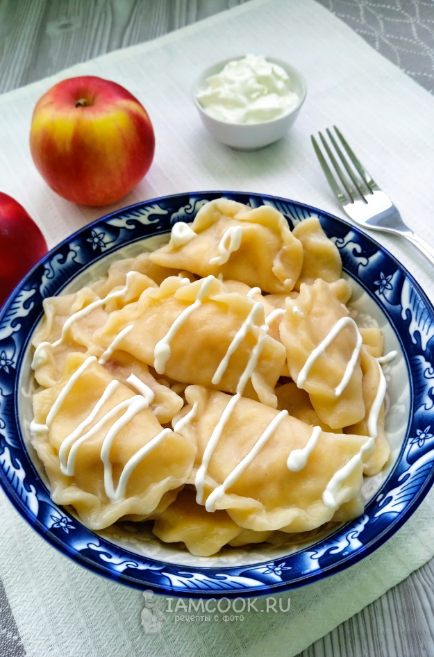 Готовые вареники с яблоками выложите на тарелку и подавайте к столу с мёдом, сметаной, вареньем.