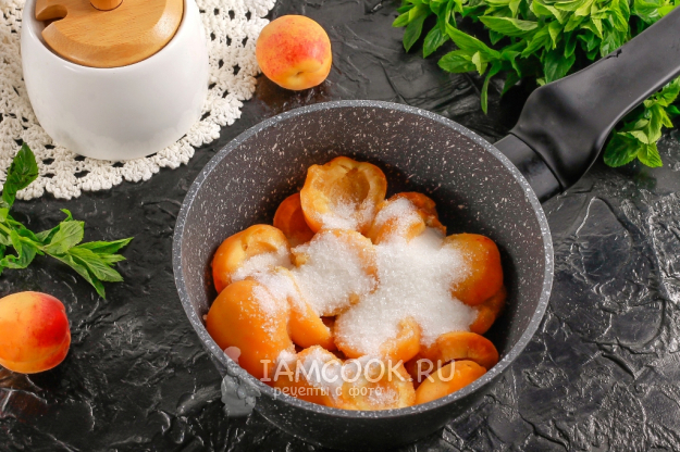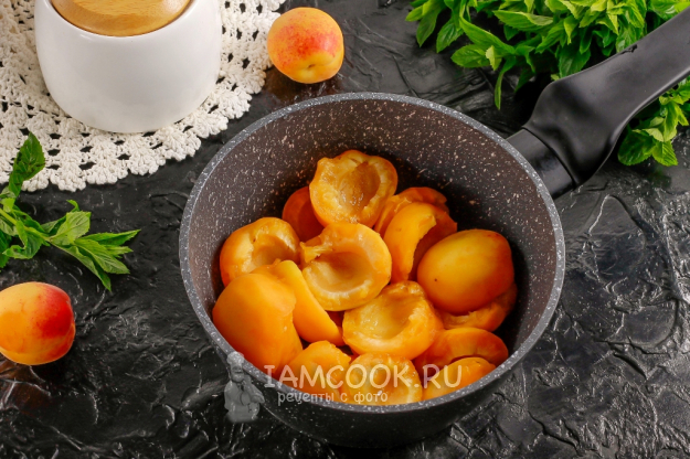 Абрикосы промойте в воде, удалите косточки. Половинки фруктов выложите в кастрюлю или ковш.