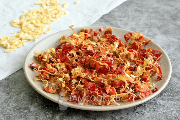 Чеснок я сушила отдельно от всех овощей и только высушенный и измельченный добавила в общую смесь.