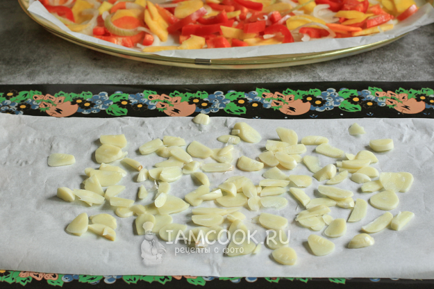 Затем разложите всю нарезку на противнях, где будете сушить. Можно постелить пергамент, который впитает лишнюю влагу. Только пергамент берите кулинарный, с покрытием.