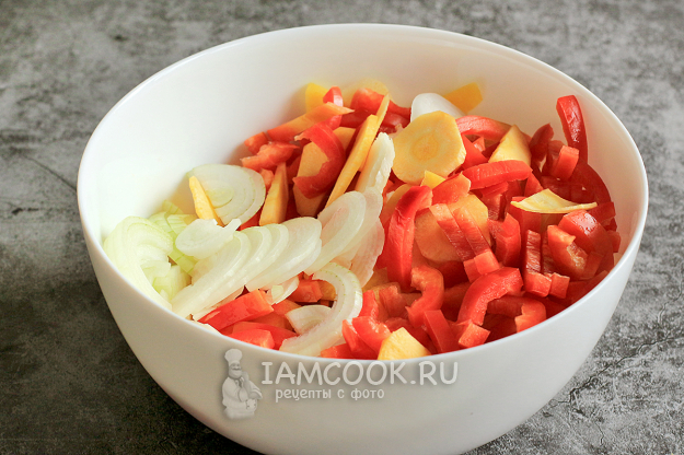 Все овощи вымойте, обсушите и нарежьте как можно тоньше. Соедините нарезанные овощи в удобной емкости и хорошенько перемешайте.