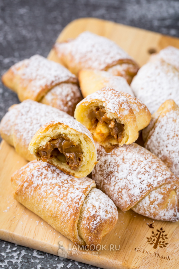 Вот такие рогалики я пекла из ночного дрожжевого теста с вареной сгущенкой.