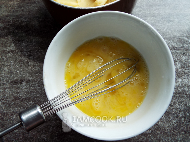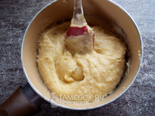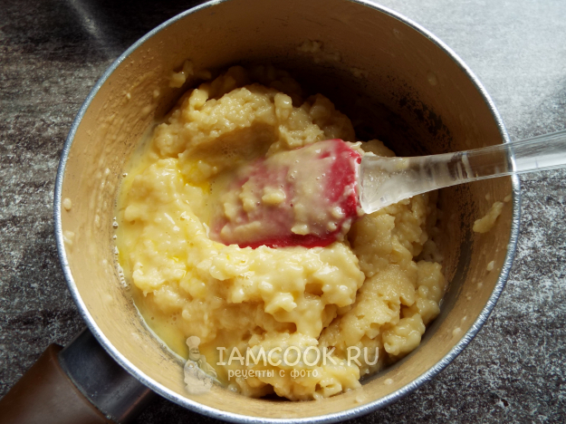 Постепенно добавлять яйца в тесто и тщательно перемешивать лопаткой.