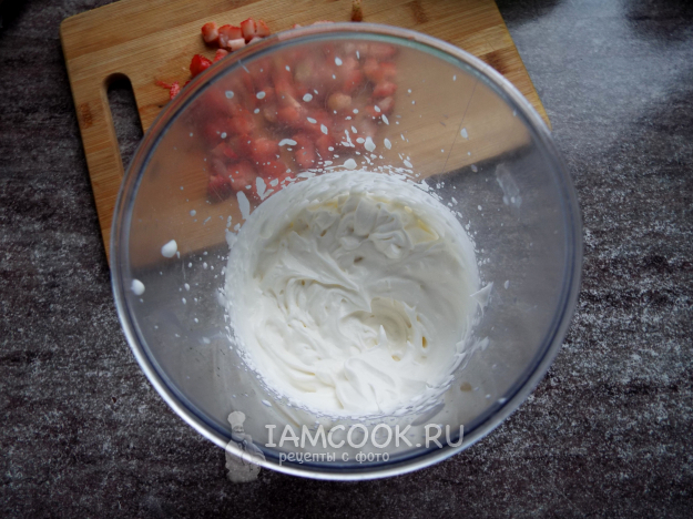 И взбить холодные сливки с сахарной пудрой до стойкого крема.