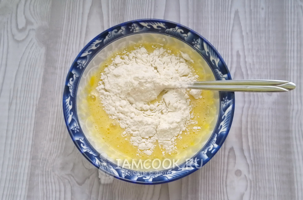 Добавьте соль и постепенно насыпьте просеянную муку.