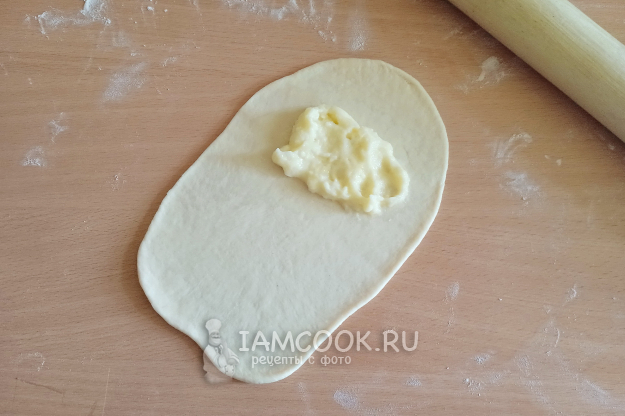 Каждый шарик раскатайте в овал. Выложите на тесто чайную ложку с горкой крема "Патисьер".