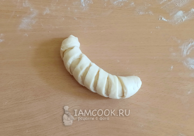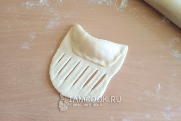 На противоположной стороне теста сделайте надрезы. Другим концом овала накройте крем и хорошо зафиксируйте.