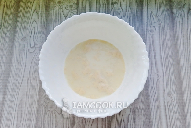 Крем готов, можно приступать к тесту. В миску выложите прессованные дрожжи. Их можно заменить сухими, уменьшив количество в 3 раза. Налейте теплое молоко, добавьте сахар и дайте дрожжам активироваться. На это потребуется минут 10-15.